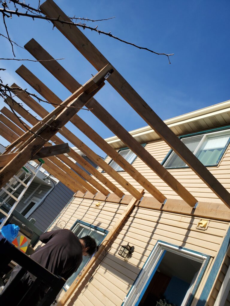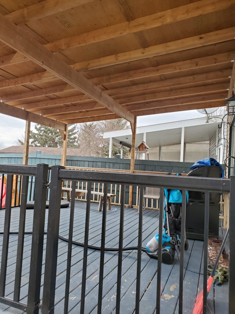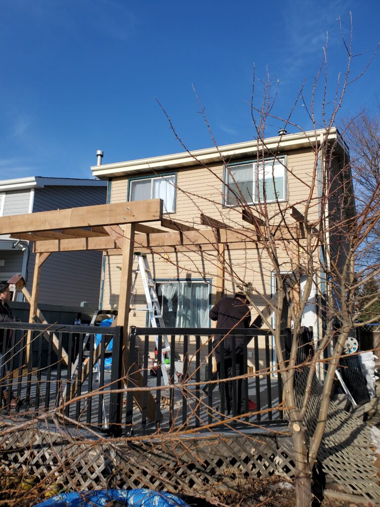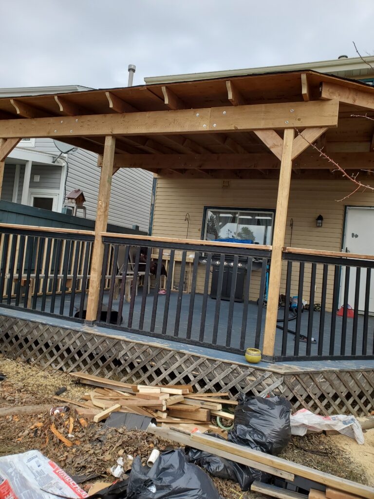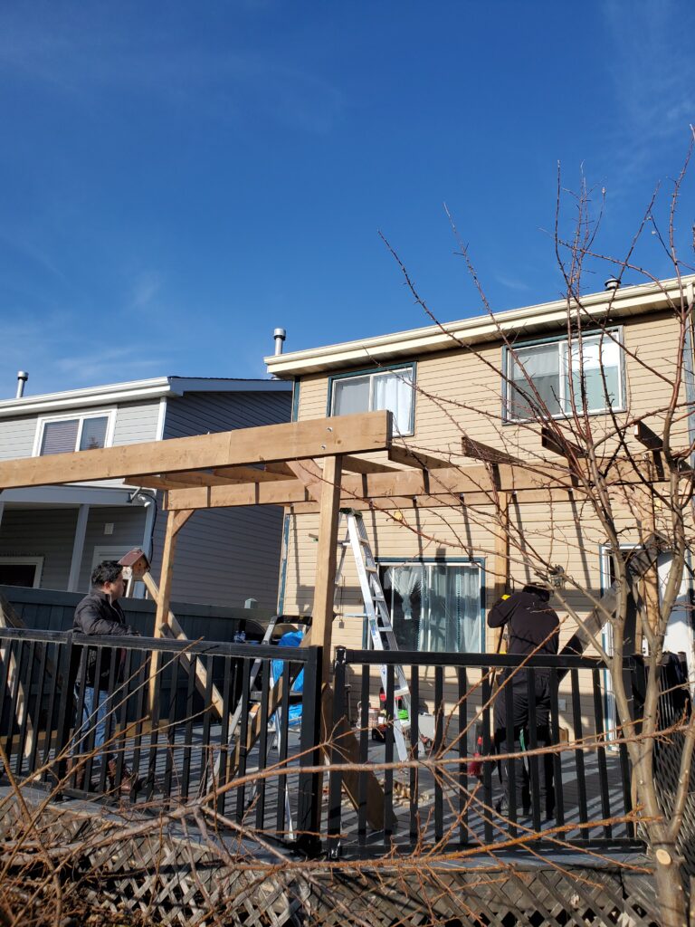 tags: Backyard, Carpentry, Composite Deck, Deck, Pergola, Railings, Residential, Roofing, Siding, Stained, Wood, Wood Framing